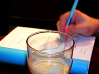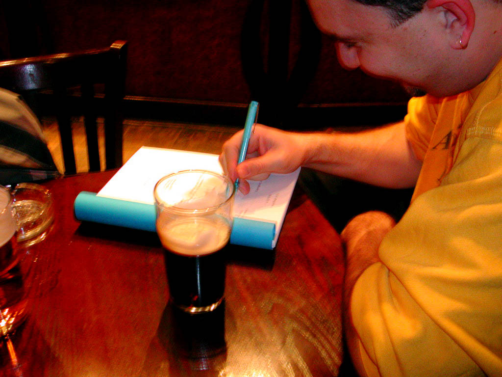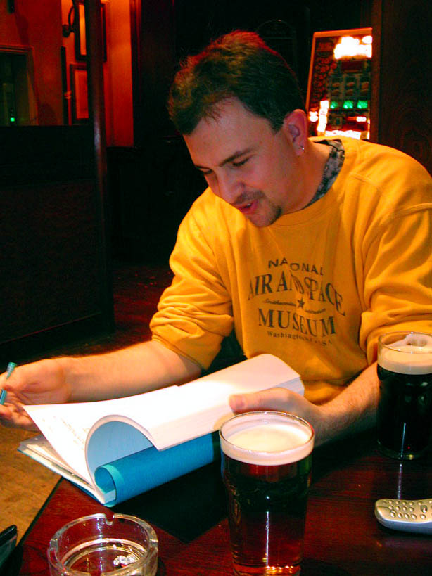 But he insisted, and I signed away while Gaby took some pictures on his digital camera. I include the pictures here for your perusal, and if I look drunk in them... well, its because I was. As was John, as was Gaby. And I have to be honest and say it shows on all our faces. *grin.*